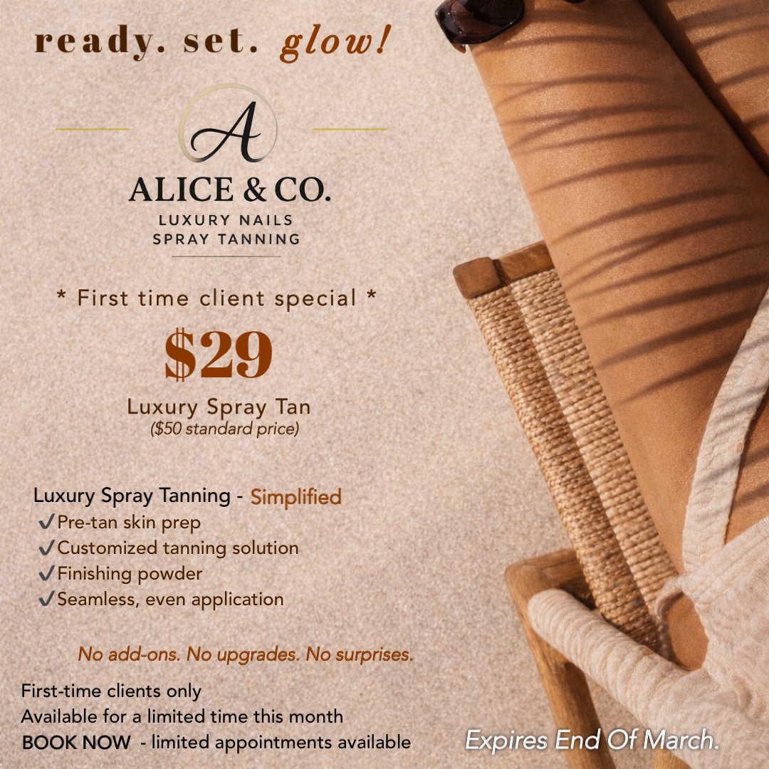 Your spray tan will be applied by Melissa (the owner of Alice and Company). There are additional appointment times available on her page below, if you do not find a time that works for you, contact Melissa at 419-450-7718.